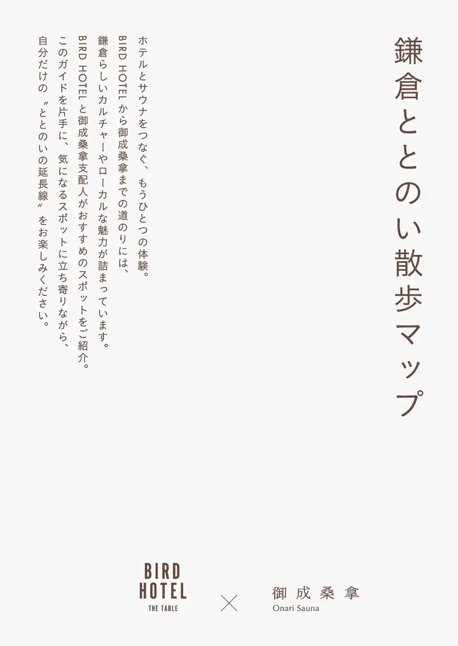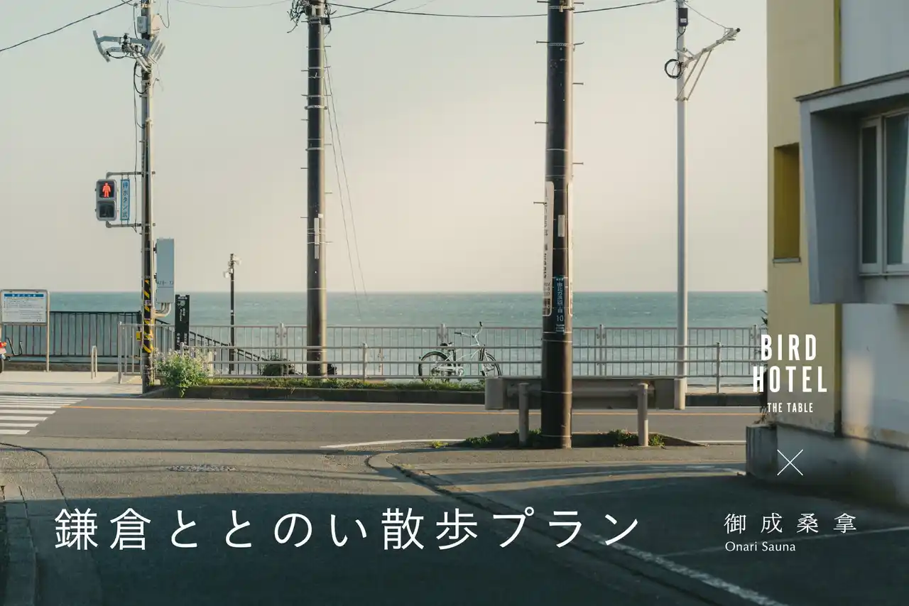 株式会社GREENING(東京都渋谷区、取締役CEO:関口正人)が運営する鎌倉・由比ヶ浜のガーデンホテル「BIRD HOTEL」は、鎌倉のコミュニティサウナ「御成桑拿(おなりさうな)」とのコラボレーション企画「鎌倉ととのい散歩プラン」を2026年5月1日(金)より販売いたします。 |
