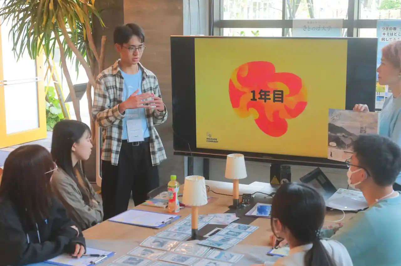 また、さとのば大学オリジナルの「地域留学体験ゲーム」では、1年ごとに拠点を変える4年間を疑似体験。日本地図を前に、暮らしたい地域を選び、一人一人異なる経験を積み重ねていくオリジナルの4年間から、「自分が何かに熱中したいと思っていることに気づいた」など、今の自分に必要なものを見つける機会となりました。 |