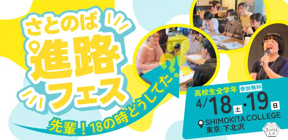 日本全国の地域をキャンパスに「新しい学び方」を提案するさとのば大学(運営:株式会社アスノオト 代表取締役:信岡良亮、所在地:東京都千代田区)は、2026年4月18日・19日の2日間、東京・下北沢のSHIMOKITA COLLEGEにて体験型イベント「進路フェス2026」を開催。実行委員会形式へと進化した今年は、さとのば大学を含む11の教育団体・企業・大学等が参画し、多様なコンテンツを提供しました。 |