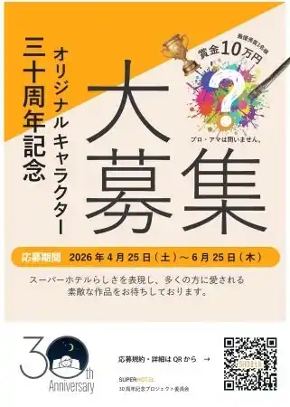 「Natural, Organic, Smart」をコンセプトに国内外180店舗のホテル運営を手掛ける株式会社スーパーホテル(所在地:大阪府大阪市、代表取締役社長:山本健策)は、1号店のオープンから今年で30周年を迎えることを記念し、2026年4月24日(金)から6月25日(木)の間、「スーパーホテル30周年 あなたの夢叶えます」キャンペーンと「30周年記念 オリジナルキャラクター大募集」の二大参加型企画を始動します。
