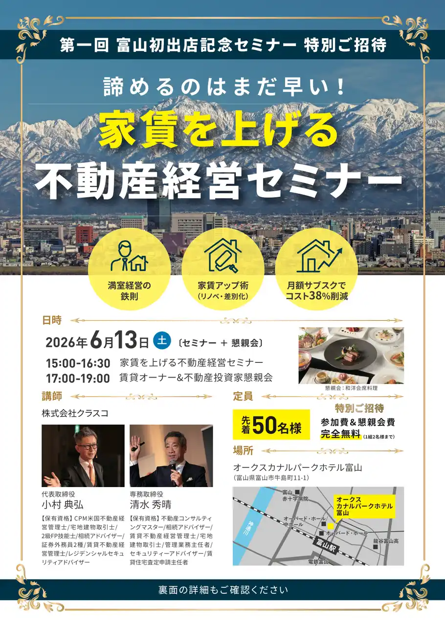 | 2026年6月13日:第1回 富山出店記念セミナー開催「家賃を上げる満室経営の鉄則」 | ||||||||||||