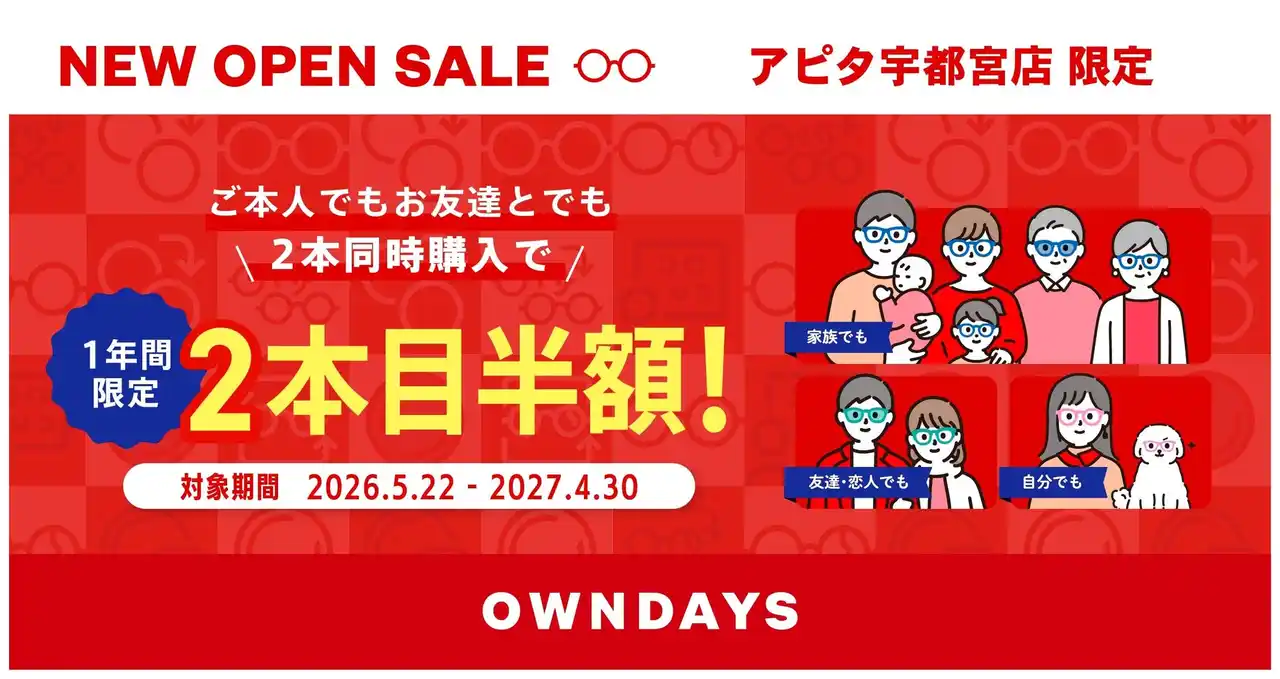| アピタ宇都宮店では、「NEW OPEN SALE」終了後の2026年5月22日(金)から2027年4月30日(金)まで、OWNDAYSのメガネ・サングラスを2本以上同時購入で2本目以降がすべて半額になる「2本目誰とでも半額割」を開催いたします(※2)。本キャンペーンは、ご本人様だけでなく、ご家族やご友人様も対象となるお得なキャンペーンです。ペアでのご購入はもちろん、シーンや用途に合わせてメガネを使い分けたい方にもおすすめのキャンペーンとなっています。 | |||||||||||