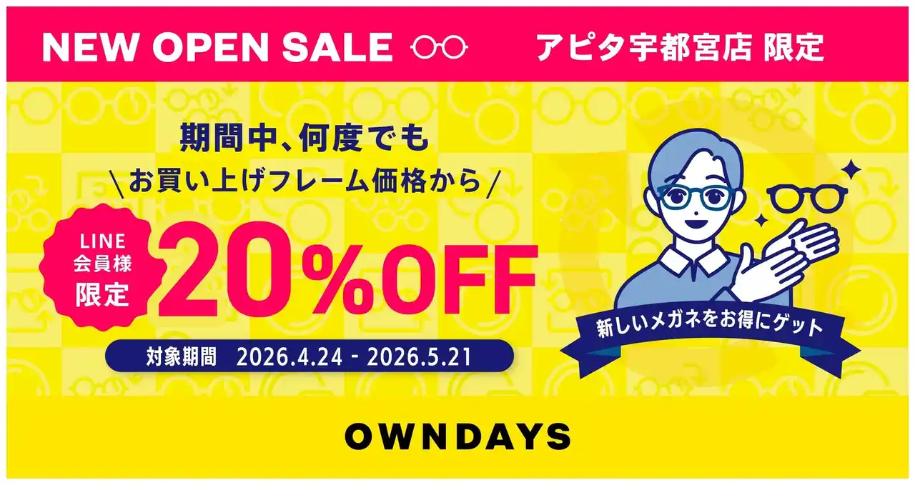 | 2026年4月24日(金)から2026年5月21日(木)までの期間、アピタ宇都宮店をご利用いただくお客様を対象に、6,000円(税込)以上のフレームが表示価格から20%OFFとなる「NEW OPEN SALE」を実施いたします(※2)。本キャンペーンは、OWNDAYS公式LINEアカウントへのご登録を条件に、期間中、何度でもご利用いただけるお得な内容となっています。この機会にぜひご利用ください。 | |||||||||||