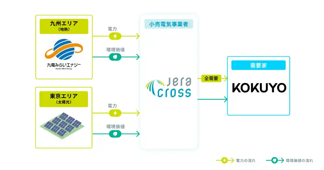 | JERA Crossはアグリゲーターとして、九電みらいエナジー株式会社から調達した地熱由来の電力と、複数のオフサイト太陽光発電所の電力を組み合わせて、「THE CAMPUS」へ供給します。年間再生可能エネルギー供給量は約37.5万kWhを見込み、本スキームによる想定削減効果は年間約159t-CO2(*1)です。 | |||