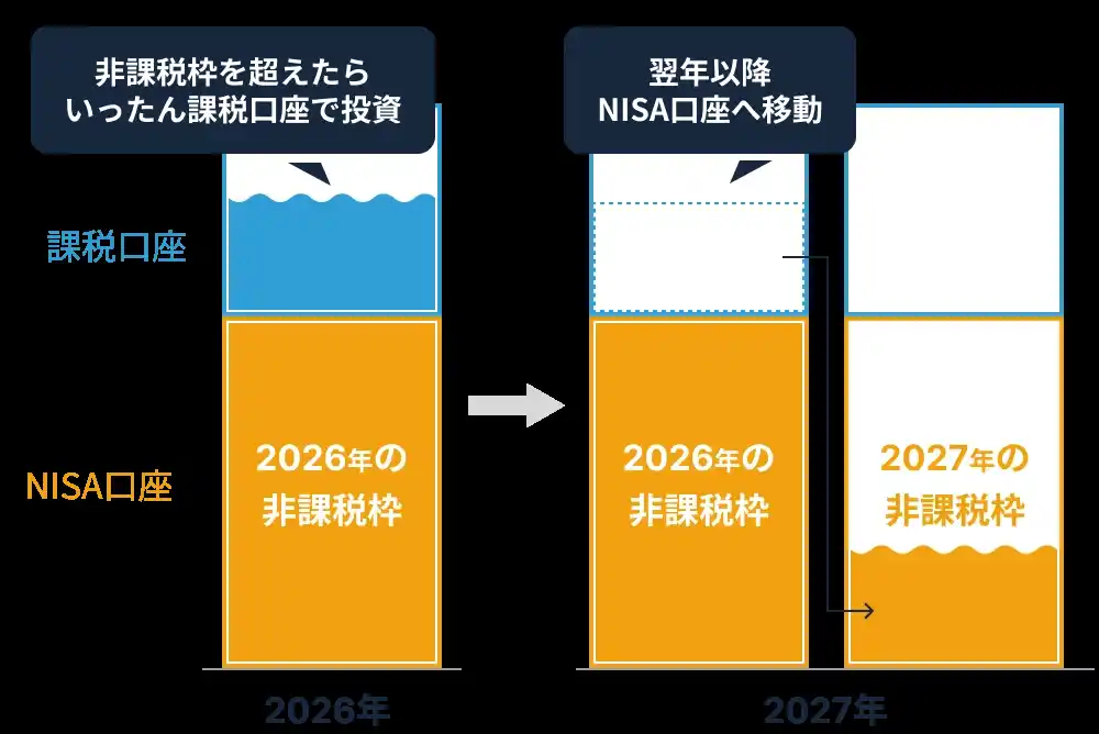 ※お客さまのリスクレベルや投資金額、「節枠」機能により、積立額の一部が「成長投資枠」や「課税口座」で運用される場合があります。これにより、年間の非課税枠のすべてを消費しない可能性がございます。詳細はこちらをご確認ください。 |