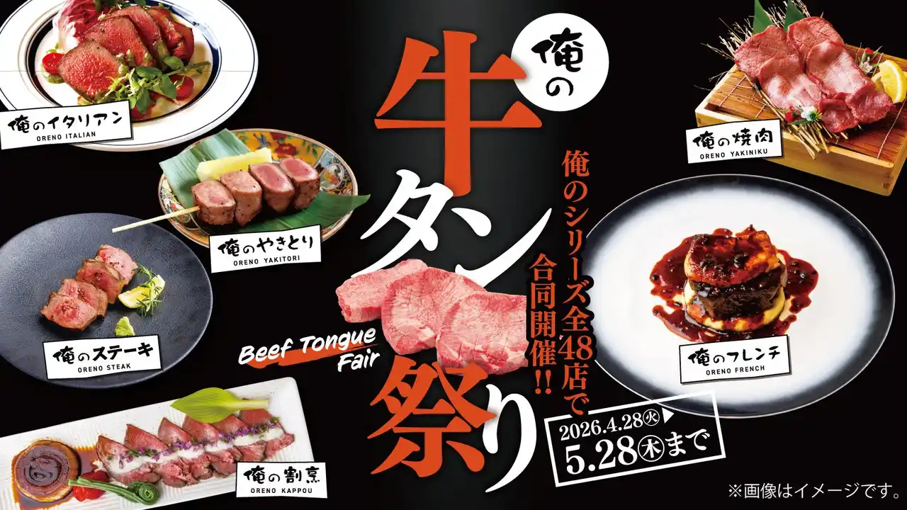 | 俺の株式会社(本社:東京都中央区/代表取締役社長:桜井暁史)は、全国の「俺の」シリーズ全48店舗にて、“牛タン”を主役にした期間限定フェア『俺の牛タン祭り』 を、2026年4月28日(火)から5月28日(木)まで開催いたします。 | |||||||||
