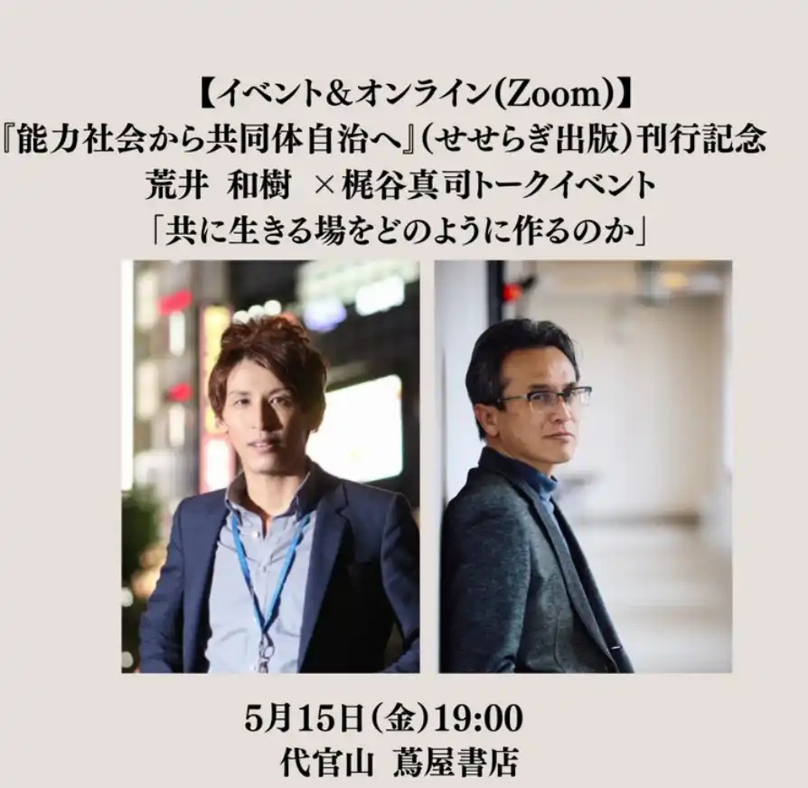| 全国こども福祉センター理事長・荒井和樹の著書『能力社会から共同体自治へ』(せせらぎ出版)の刊行を記念し、2026年5月15日(金)に代官山 蔦屋書店にて、東京大学大学院総合文化研究科教授で哲学者の梶谷真司氏との対話イベントを開催します。 | |||