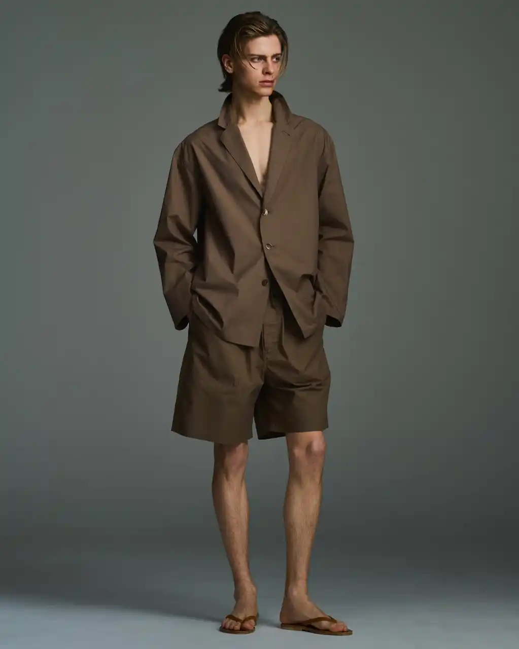 | コットンシルク タイプライターシャツと同素材(コットン80%・シルク20%の上質なタイプライター生地)を使用したイージーショーツ。ブラウンはセットアップでの着用も可能です。 パジャマ+テーラードのバランスを意識し、前下がりの強いパジャマシャツを“シャツジャケット”的に捉えたムードで構成。リラックス感がありながら、どこか端正さも感じられるセットアップスタイルに仕上げています。 一方で、街着として取り入れやすいようディテールは、ミリタリーのオーバーパンツをベースにショーツへとアレンジ。左右の切りポケットから前後どちらのポケットにもアクセスできる、ユーティリティな設計もポイントです。ラフさと機能性、そして品の良さがバランスよく同居した一本です。 | |||||||||||||||