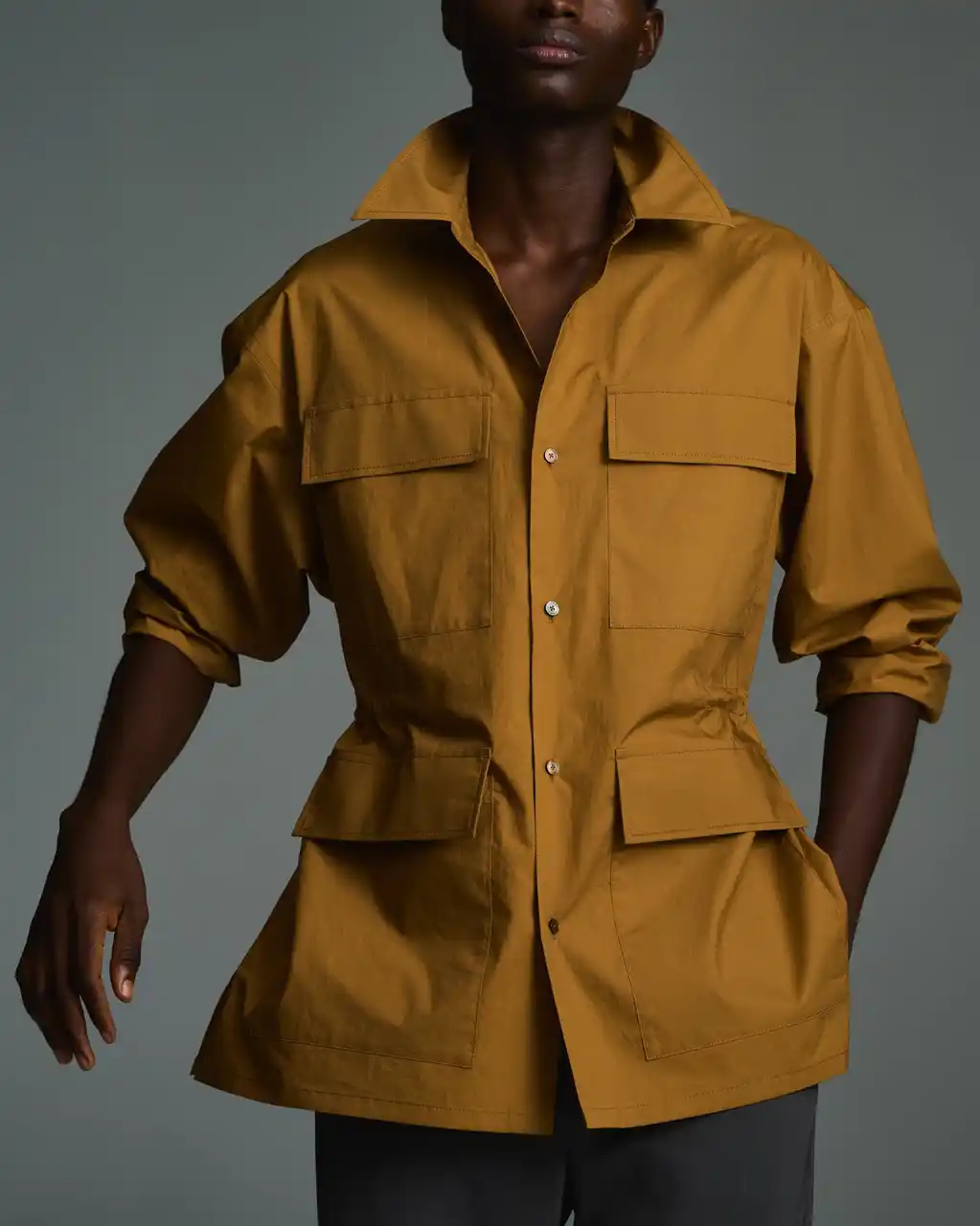 | ディテールを削ぎ落とした、ミニマルなサファリシャツジャケット。夏場のベーシックなシャツに代わる“もう一枚の羽織り”として仕立てました。 素材には、120双の打ち込みがしっかりとしたSUVINコットンを贅沢に使用。シャツ地でありながら、適度なハリと品のある表情を備えています。フラットなポケットや小ぶりな貝ボタンなど、細部もあくまでミニマルに。 ウエストにはドローコードを配し、ぎゅっと絞ってギャザーを寄せることでシルエットに変化をつけることも可能です。袖はカフス仕様にしているので、シャツのようにラフに捲って着るのもいい。軽やかさと端正さを行き来できる一着です。 | |||||||||||||||
