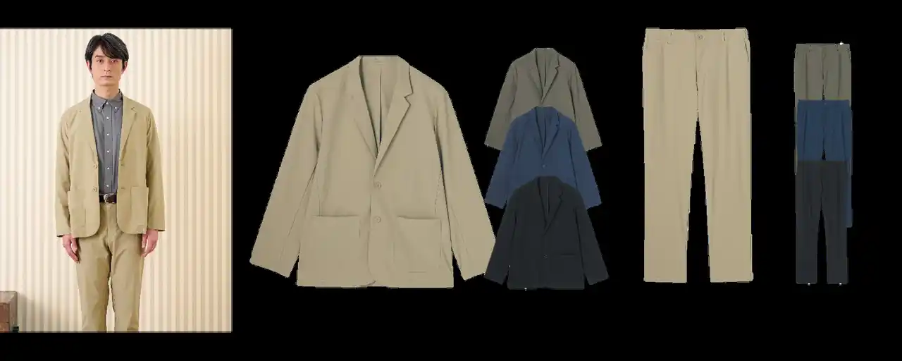 またメンズウェアからは、ビジネスからプライベートまでシーンを問わず万能に活躍する「冷感ストレッチシリーズ」のセットアップが登場しました。肌に触れた瞬間にひんやりと感じる接触冷感に加え、高い伸縮性とハリ感のある生地を採用。洗練されたテーラードジャケットのデザインながら、軽量で動きやすく、毎日袖を通したくなるような「やみつき」の着心地を実現しています。快適さと「きちんと見え」を両立した、日中は暑いのに朝晩は肌寒い今の時期におすすめのセットアップです。 |