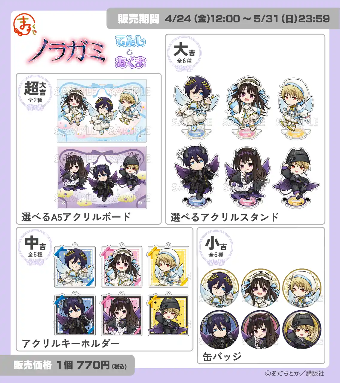 今回のまるくじ『ノラガミ』てんしとあくまでは、「天使」と「悪魔」がテーマのとても可愛らしい描き起こしちびキャライラストを使用した、オリジナルグッズをご用意しました! 各賞の商品といたしましては、A5アクリルボード、アクリルスタンド、アクリルキーホルダーなど、ファンの皆様に喜んでいただけるラインナップとなっております。 是非、この機会にお買い求めください! |