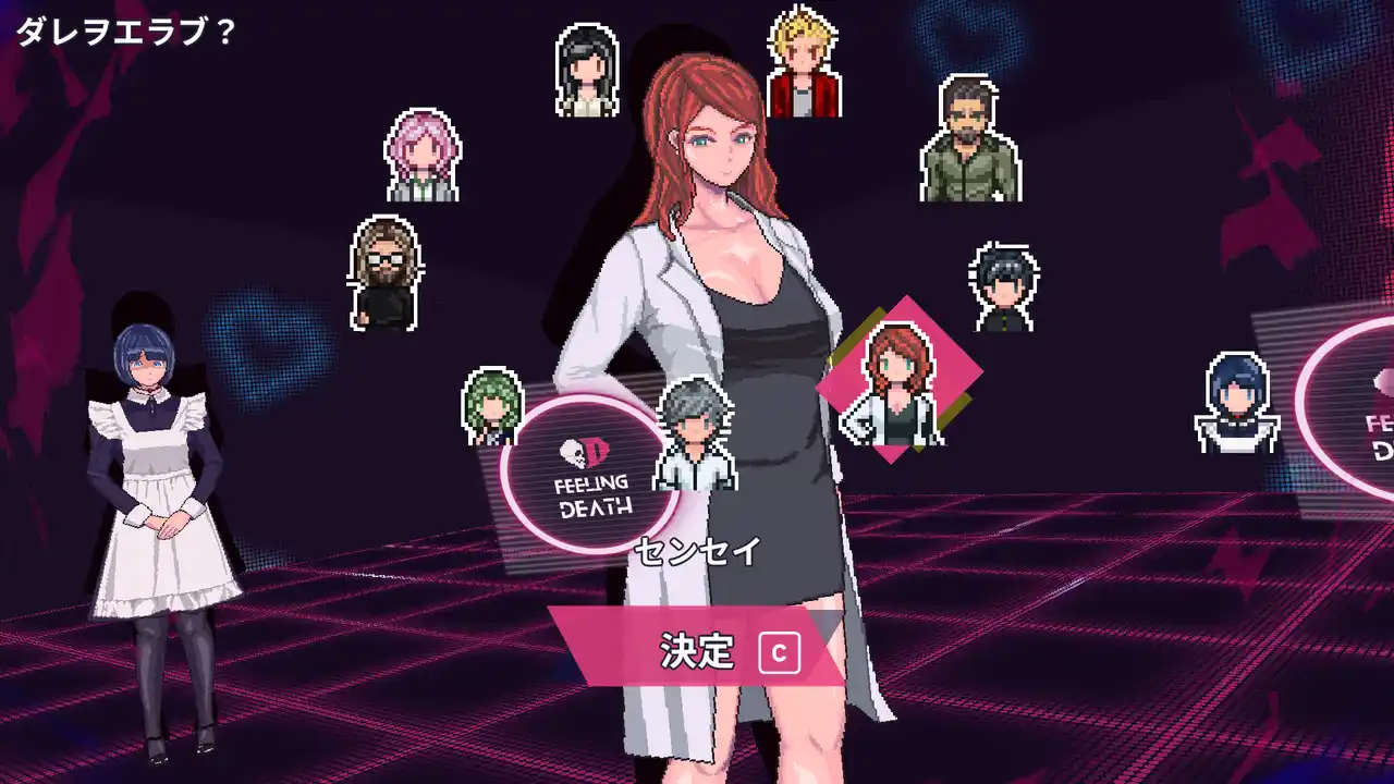 『Feeling Death』は、フィーリングカップルでカップルになると死ぬデスゲームに巻き込まれた主人公が、他者との《交流》や《捜査》を行いながら、生還を目指すミステリーアドベンチャーです。 |