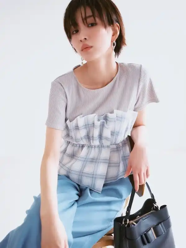チェック&無地ビスチェドッキング半袖プルオーバー |