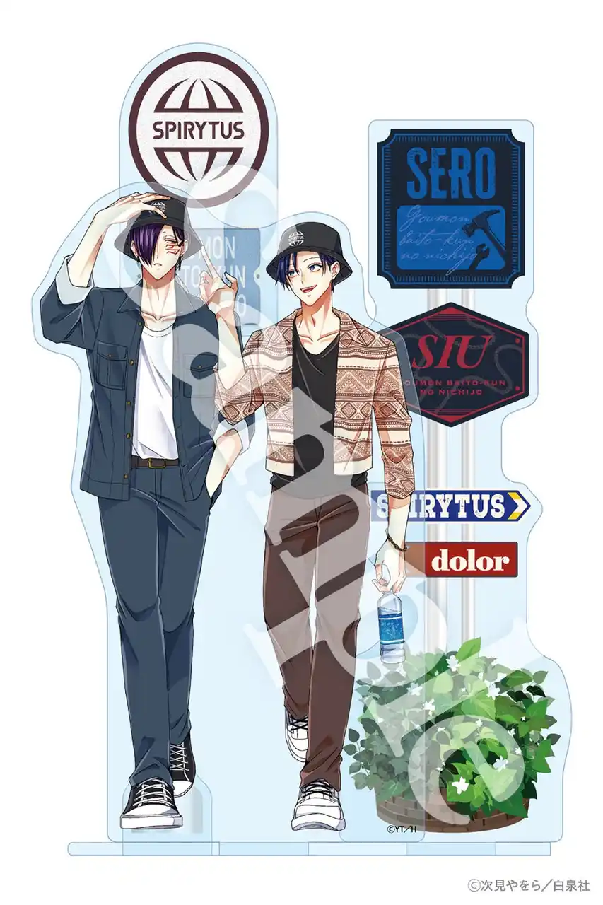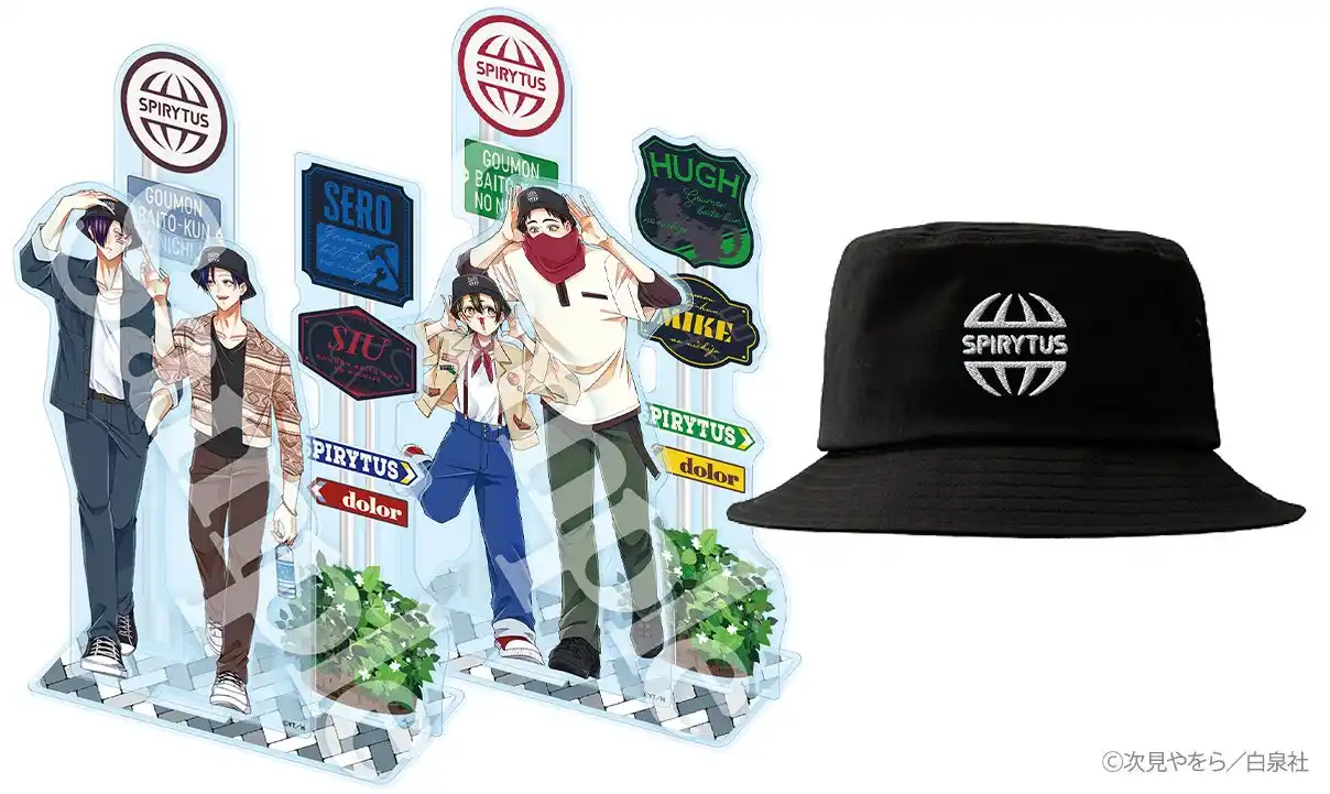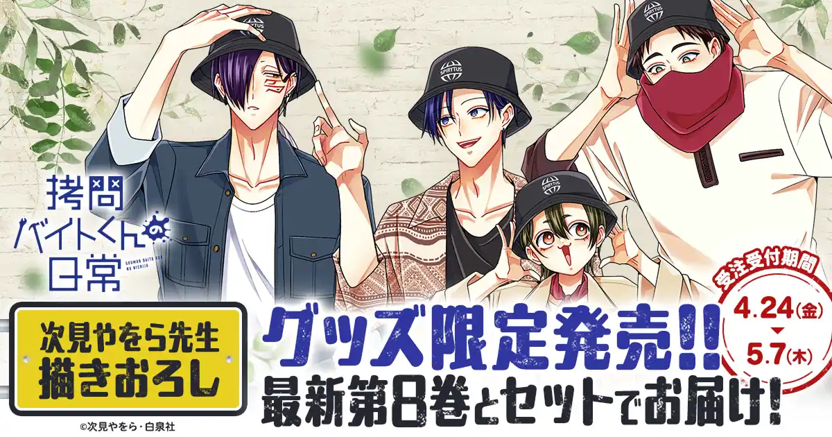 本日4月24日から5月7日までの期間中にヤングアニマルWebストアにて予約注文をいただいた方に、『拷問バイトくんの日常』第8巻と、「スピリタス社バケットハット」や、バイトくんたちがお揃いのハットを着用している描きおろしイラストを使用した「アクリルジオラマ」をセットにしてお届けします。 |
