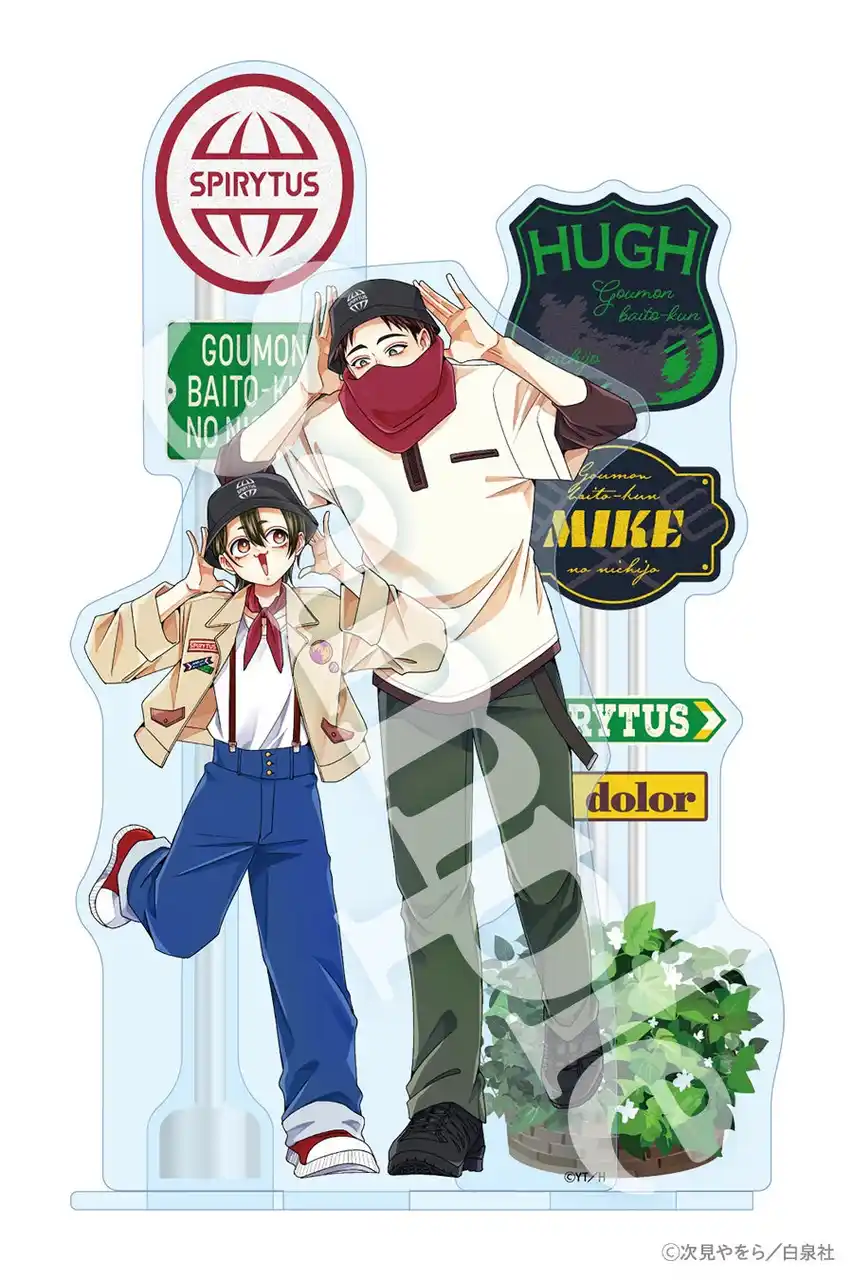 次見やをら先生描き下ろしイラストを使用したミケ&ヒューver.のアクリルスタンド。お揃いでかぶっているスピリタス社バケットハットを自慢するミケとヒューが仲良く歩く様子を立体的に表現しています。スピリタス社のロゴや名前が書かれた標識が付属。コミックス最新第8巻とセットでお届けします。 |