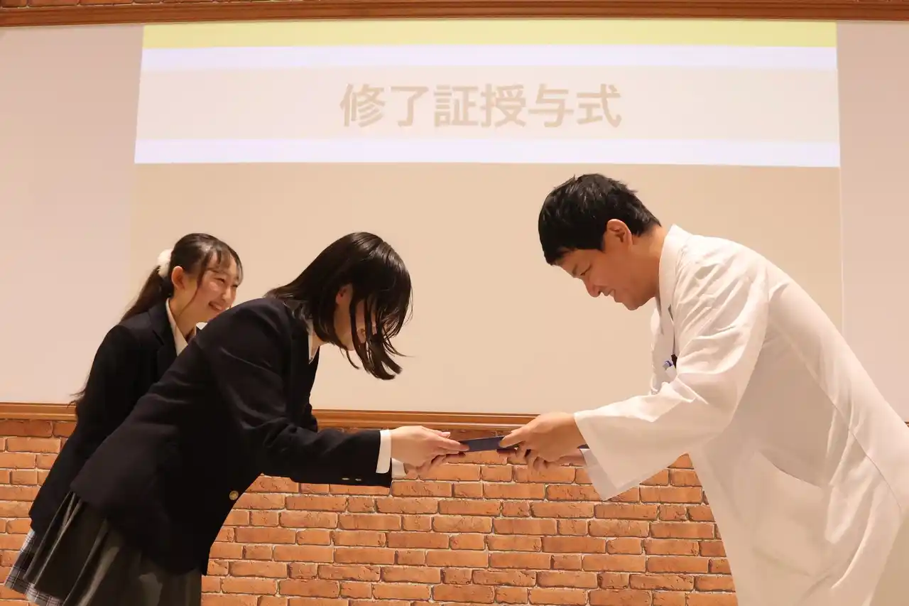 研究員から生徒に修了証を授与 |