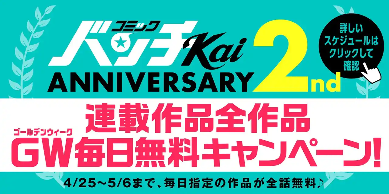 株式会社新潮社が運営するWEB漫画誌「コミックバンチKai」は、2026年4月24日(金)にサイトオープンから2周年を迎えます。これを記念し、「バンチKai ゴールデンウィーク」と題した特別企画を実施いたします。日替わり全話無料公開や豪華執筆陣によるサイン色紙プレゼント企画、新連載攻勢など、多彩な施策で2周年を盛り上げてまいります。