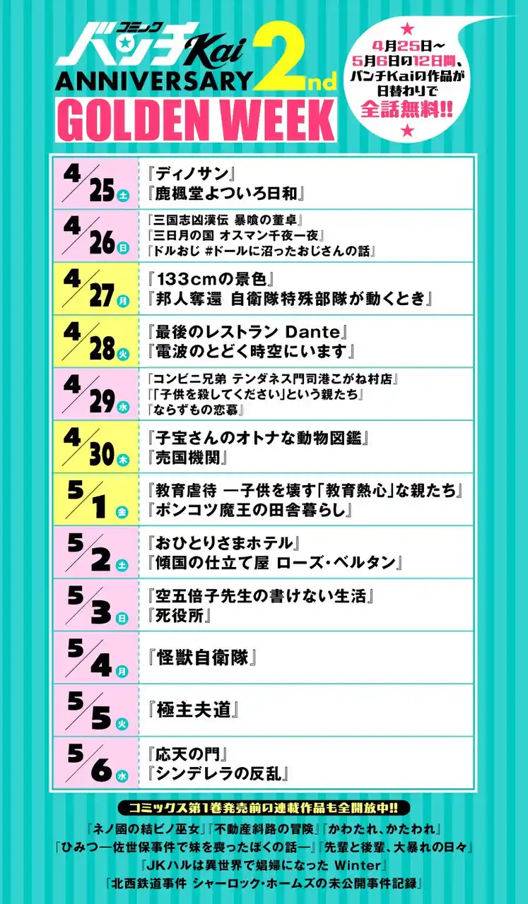 2026年4月25日(金)0:00~5月6日(水)23:59の期間中、「コミックバンチKai」の連載作品を日替わりで全話無料公開いたします。 |