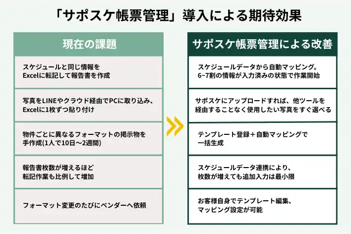 従来の業務フローとサポスケ帳票管理導入後の変化については、上図の通りです。スケジュール・写真・帳票が分断されていた従来の運用に対し、本サービスではすべての情報が一元化されることで、入力ミスや作業工数の大幅な削減が実現します(図参照)。 |