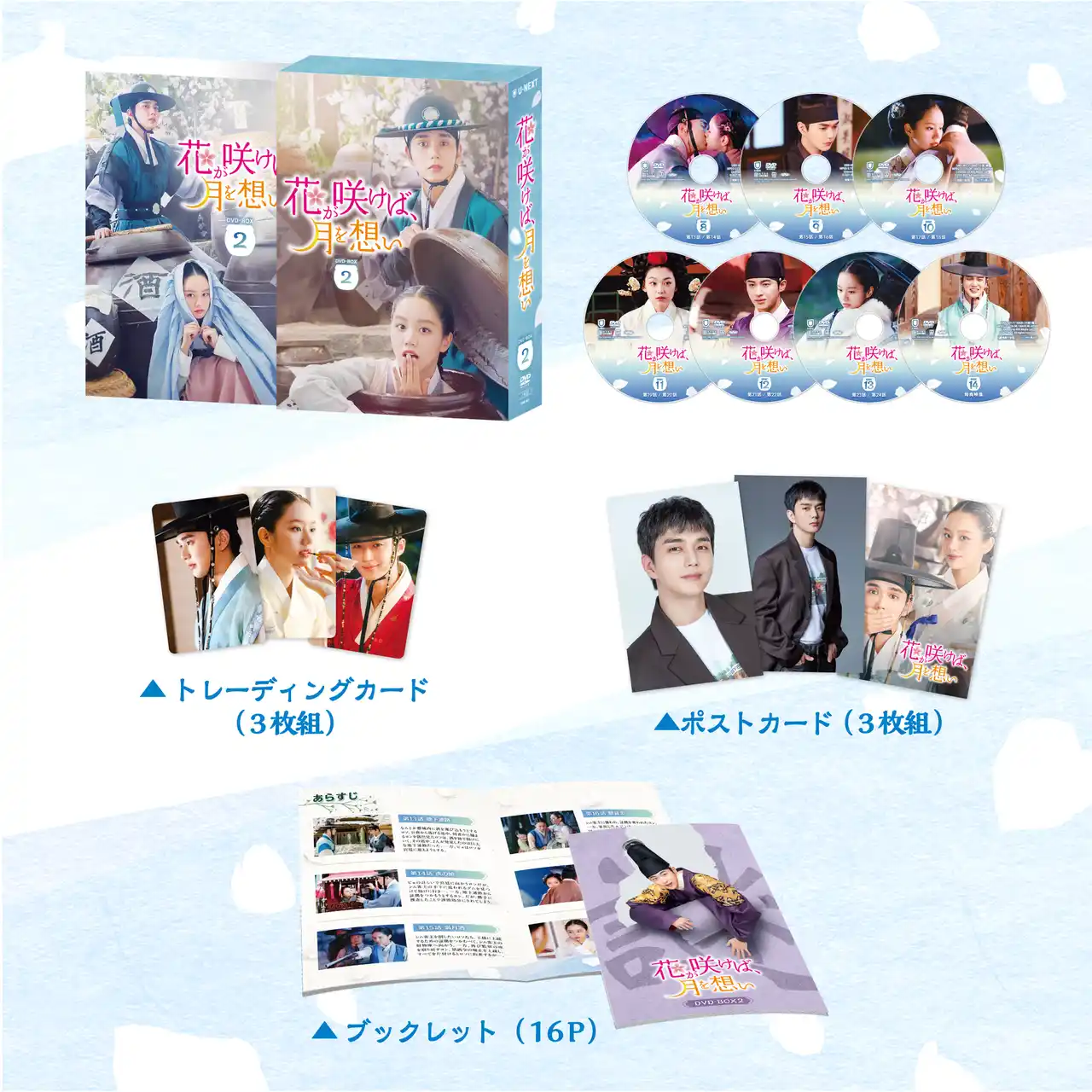 | 『花が咲けば、月を想い』DVD-BOX 2には、本編韓国語版に加え、日本語吹替版も収録。メイキングや、出演キャストによるインタビューなど、豪華特典映像も。封入特典には、ここだけのトレーディングカードや、ポストカードが封入されます。U-NEXT Asia ONLINE STORE限定発売です。ロマンス時代劇『花が咲けば、月を想い』DVD-BOX 2を、ぜひ、ご購入下さい。 | |||