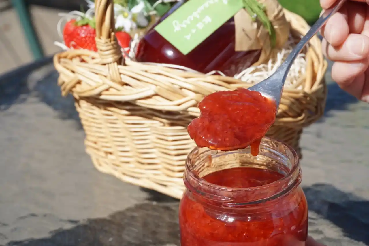 ――使用したいちごの特徴は? 「紅ほっぺ」という品種のいちごを使っています。紅ほっぺは果皮・果肉ともに濃い赤色で、ジャムにした際も鮮やかで深い赤色に仕上がります。糖度と酸度のバランスが良く、果肉がしっかりとしているので、果肉のごろっと感を味わえます。 |