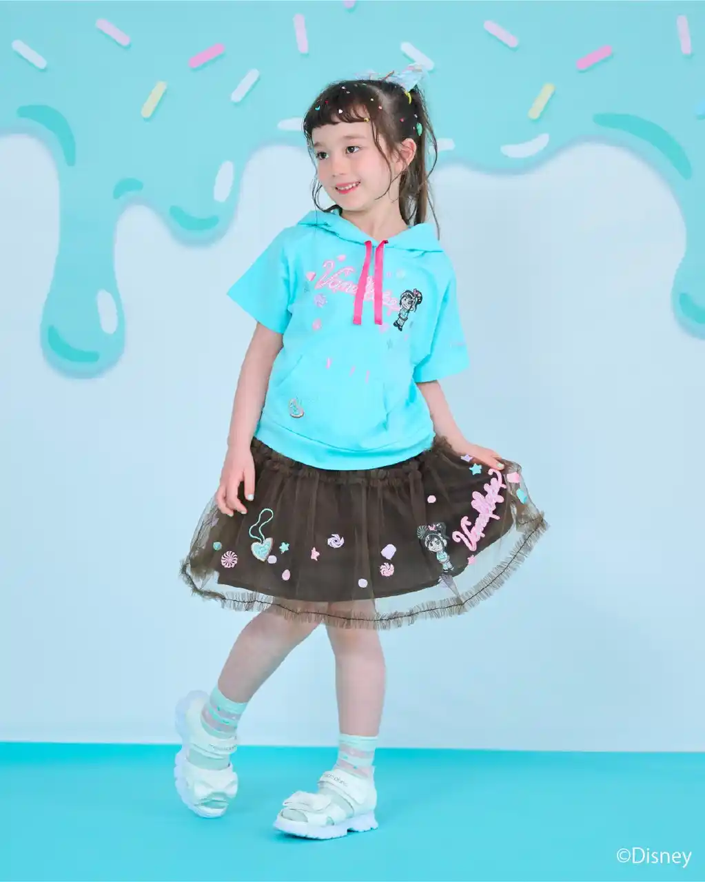 フーディーTシャツとチュールスカートは、お菓子の刺繍でキュートな世界観をたっぷり表現。 |