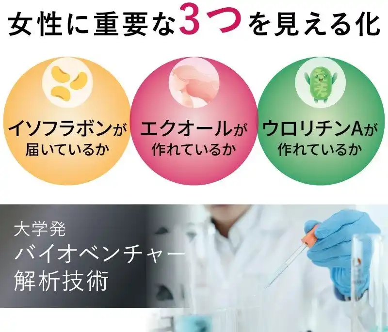 いずれも女性ホルモンに関わっているため、近年更年期の女性を中心に注目されている成分です。しかし、体質や腸内環境の違いにより、十分に産生できない方が一定数います。 |