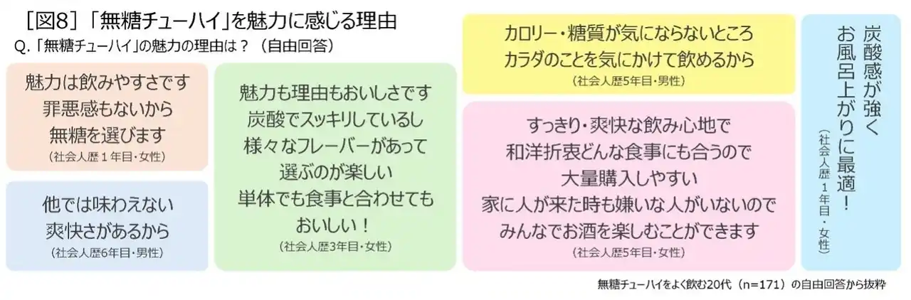 | その魅力の理由をさらに自由回答で聞いてみると、食事との食べ合わせや味わいに惹かれて、「無糖チューハイを選ぶ様子や、お風呂上がりや来客時など様々なシーンで無糖チューハイを楽しむ様子が垣間見えました[図8]。シーンや気分次第で“今の自分にフィットする一杯”を求める20代のお酒選びをしたい20代らしい「無糖チューハイ」の楽しみ方が明らかになりました。 | |||||||||