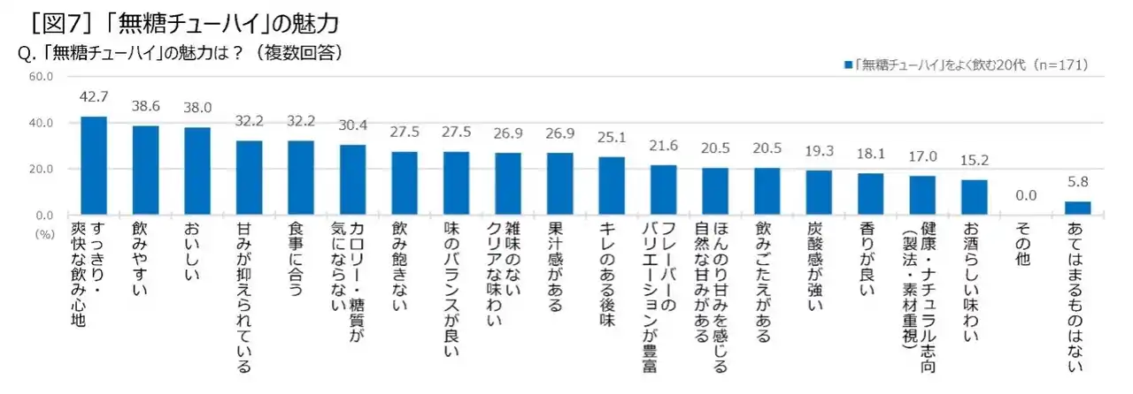 | 「無糖チューハイ」をよく飲むと答えた20代に、無糖チューハイの魅力を聞くと、「すっきり・爽快な飲み心地」(42.7%)、「飲みやすい」(38.6%)、「おいしい」(38.0%)、「甘味が抑えられている」「食事に合う」(32.2%)といった理由が「カロリー・糖質が気にならない」(30.4%)を抑えて、上位に挙げられました。[図7]。外飲み、家飲み、どちらにおいても重視されるおいしさや飲みやすさ、食事との相性の良さを兼ね備えたアイテムであるようです。 | |||||||||