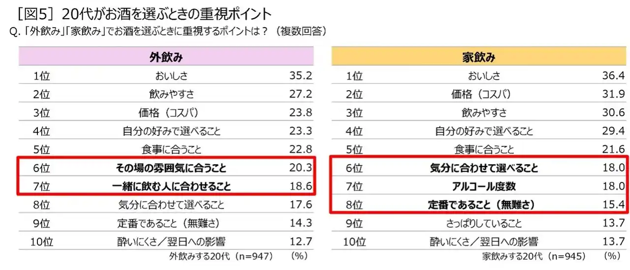 | シーンや気分に応じてお酒を選ぶ傾向が見られた20代ですが、外飲み・家飲みそれぞれで、お酒選びのポイントを聞きました。どちらにおいても「おいしさ」、「価格(コスパ)」、「飲みやすさ」、「自分の好みで選べること」、「食事に合うこと」がTOP5となりシーンを問わず重要な要素が明らかになった一方、6位以降の項目には家・外で差が見られました。外飲みでは「その場の雰囲気に合うこと」、「一緒に飲む人に合わせられること」といった周囲と過ごす時間を意識し、家飲みでは「気分に合わせて選べること」「アルコール度数」といった自分に合ったお酒選びをする様子がうかがえました[図5]。 | |||||||||