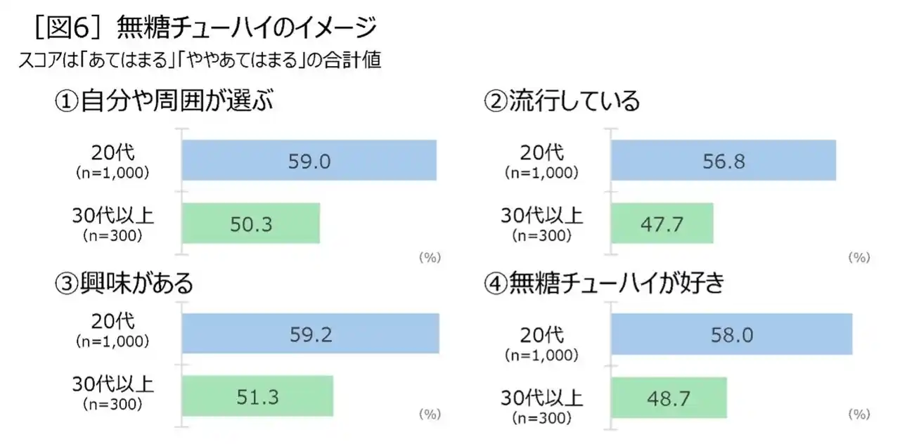 | 次に「無糖チューハイ」のイメージを4段階(あてはまる、ややあてはまる、あまりあてはまらない、あてはまらない)で答えてもらいました。無糖チューハイについて「自分や周囲が選ぶ」「流行している」「興味がある」「好き」といった項目で、いずれも30代以上を上回る結果となりました。特に差がついたのは、「無糖チューハイが好きだ」とストレートに評価する声で、30代以上(48.7%)より9.3ポイント高い結果となりました。「無糖チューハイ」は、単なる“身近なお酒”にとどまらず、自分の嗜好やトレンド意識に合ったお気に入りアイテムとして20代に選ばれていることが分かりました[図6]。 | |||||||||
