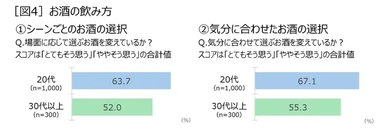 | まずお酒の飲み方を聞き、4段階(とてもそう思う、ややそう思う、あまりそう思わない、全くそう思わない)で答えてもらいました。すると、20代の63.7%が「場面に応じて選ぶお酒を変えている」、67.1%が「気分に合わせて選ぶお酒を変えている」と答えました。30代以上と比べると20代の方がどちらもスコアが10ポイント以上高く、“とりあえずの一杯”ではなく、シーンや気分次第で“今の自分にフィットする一杯”を選ぶ様子がうかがえました[図4]。 | |||||||||