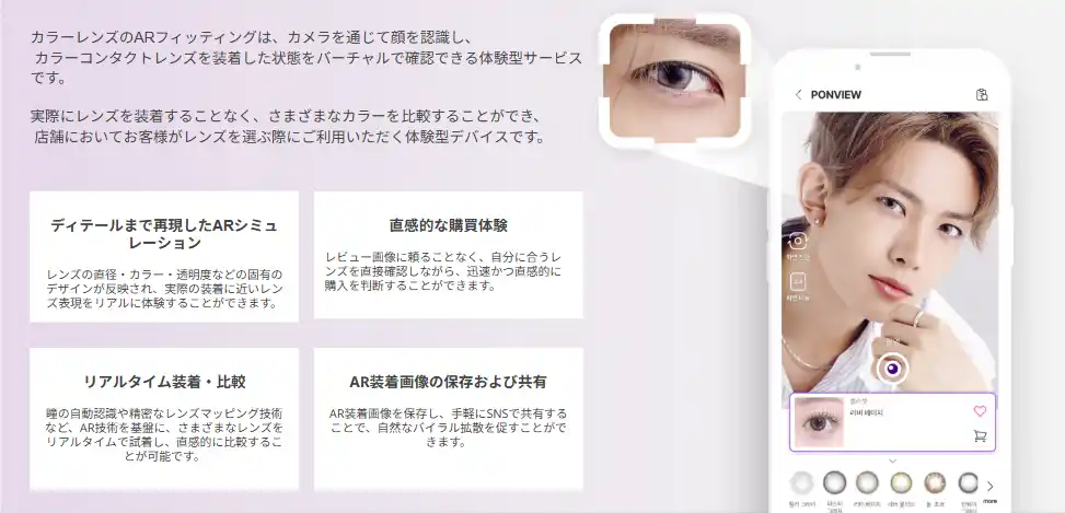 さらに、店舗ではAR(拡張現実)を活用したフィッティングサービスを導入しており、お客様が多様なレンズカラーやデザインをバーチャル上で体験いただける環境を整えております。これにより、個々の瞳の特徴やイメージに適したレンズ提案が可能となり、より満足度の高い購買体験を実現しております。 |