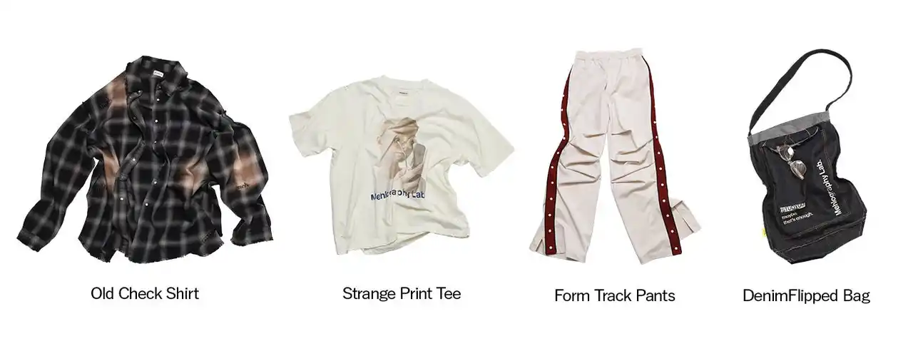 「Strange Print Tee」は、見覚えがあるようでいてはっきりしないグラフィックを採用したヴィンテージTシャツ。着る人によって異なる解釈が生まれるデザインです。「Old Check Shirt」はヴィンテージの風合いを再現したチェックシャツ。「Denim Flipped Bag」は内側と外側を反転させた構造のトートバッグで、普段は見えない面をあえて表に出しています。「Form Track Pants」は一見シンプルなシルエットながら、着用時に気づく独自のラインを持たせたトラックパンツです。 |