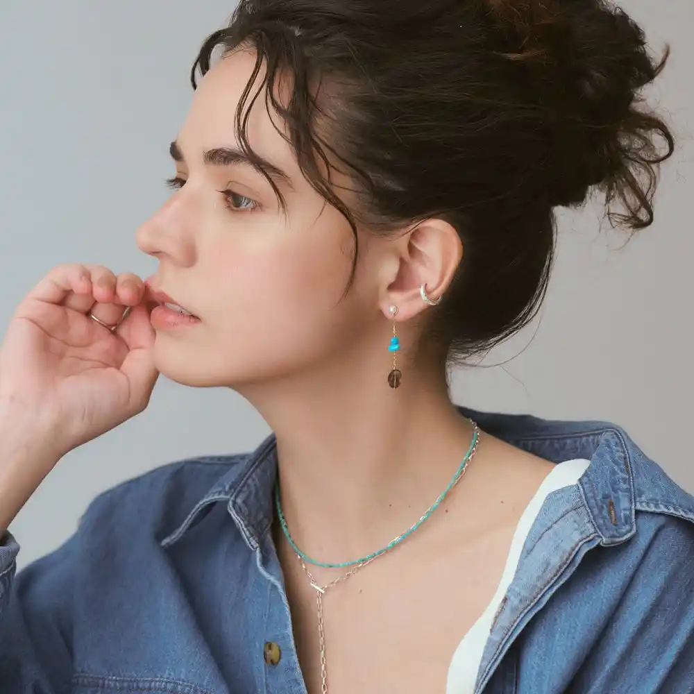 [from top] necklace charm 78,100yen/ ring 69,300yen 石と石が重なり合う部分が、水彩画のように溶け合うリング&チャーム。薄くカットされたグリーンクォーツの透明感と、ターコイズの存在感のコントラストが魅力です。 |