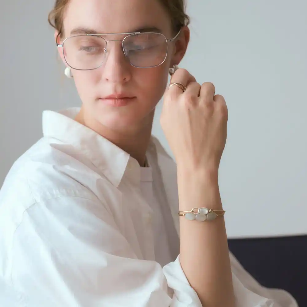 bracelet 30,800yen クォーツ×シェルのダブレット。オーバルカットの石の魅力をシンプルに楽しめるバングル。 |