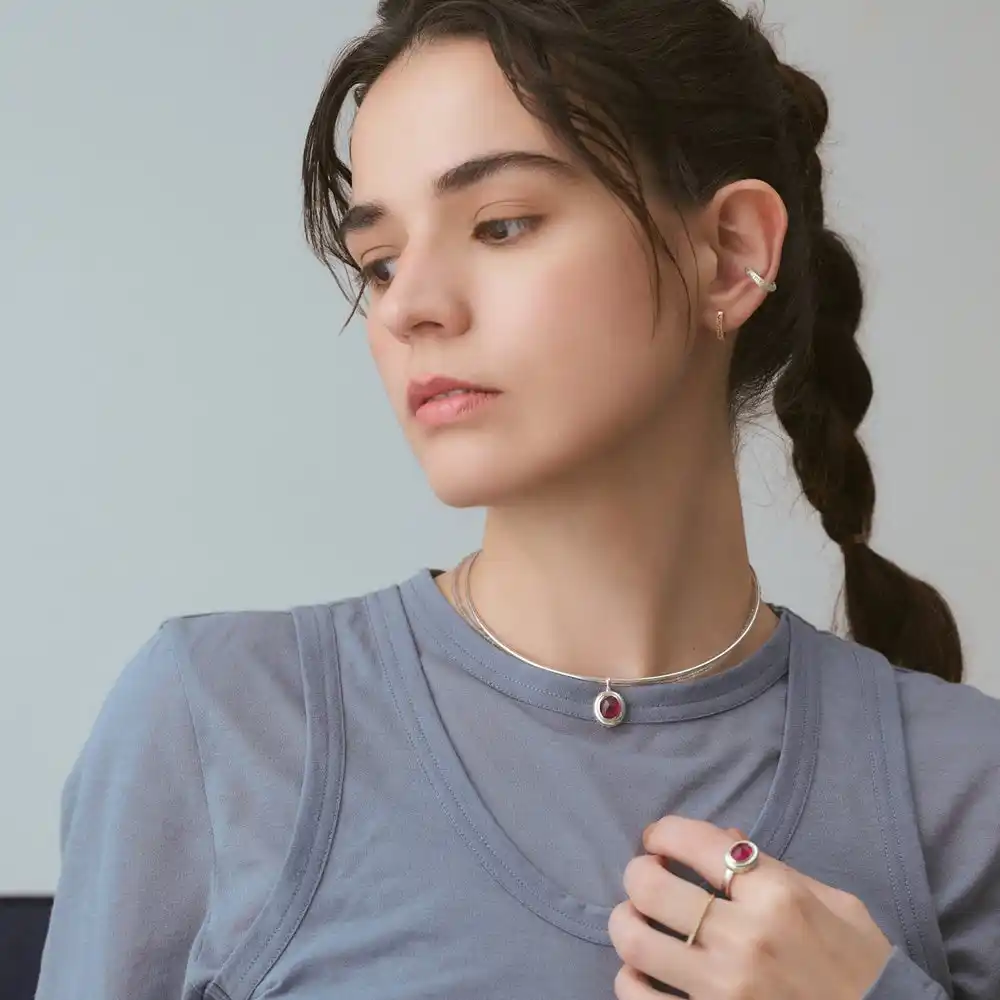 [from top] necklace charm 77,000yen/ ring 83,600yen ルビーの美しい色合いを引き立てるのは、絶妙なバランスにこだわったゴールドの石枠。コーディネートによっても表情を変える、気品ある佇まいが主役級の存在感に。 |