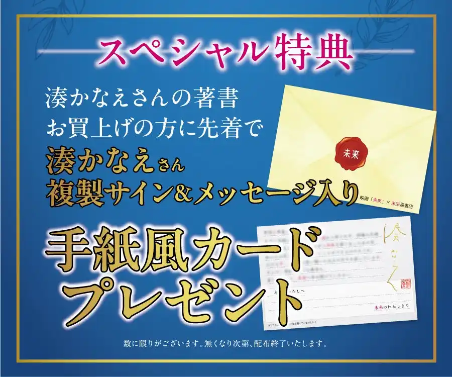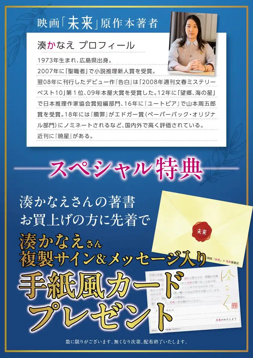 本特典は、映画『未来』にちなみ、湊かなえ氏ご本人が“過去の自分へ宛てて書いた手紙”を掲載した特別仕様。複製サイン入りの本フェア限定デザインとなっております。 |