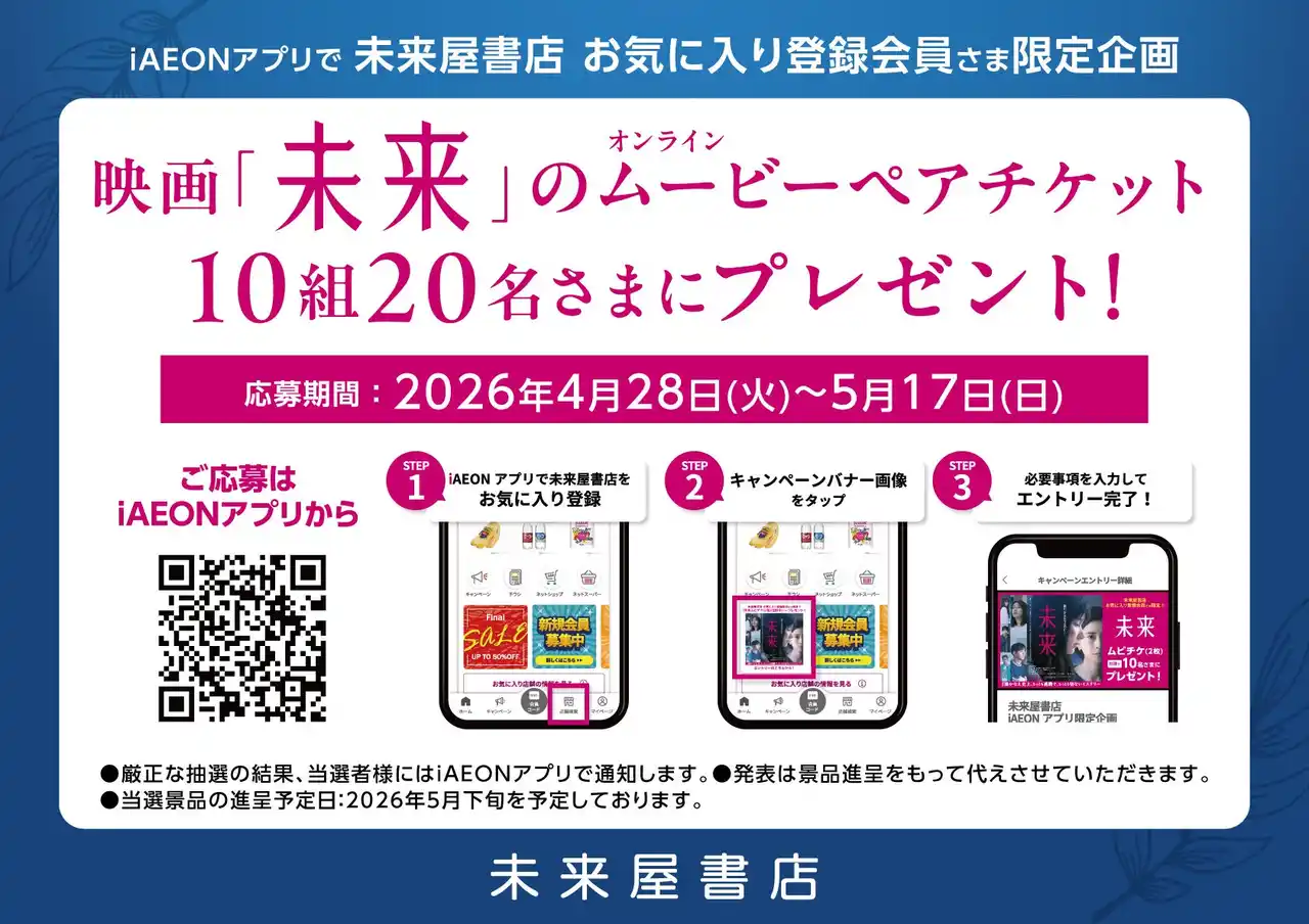 また、iAEONアプリ内で2026年4月28日(火)から5月17日(日)までの期間、抽選で10名様に映画『未来』のペアチケットが当たる応募キャンペーンを実施します。 |