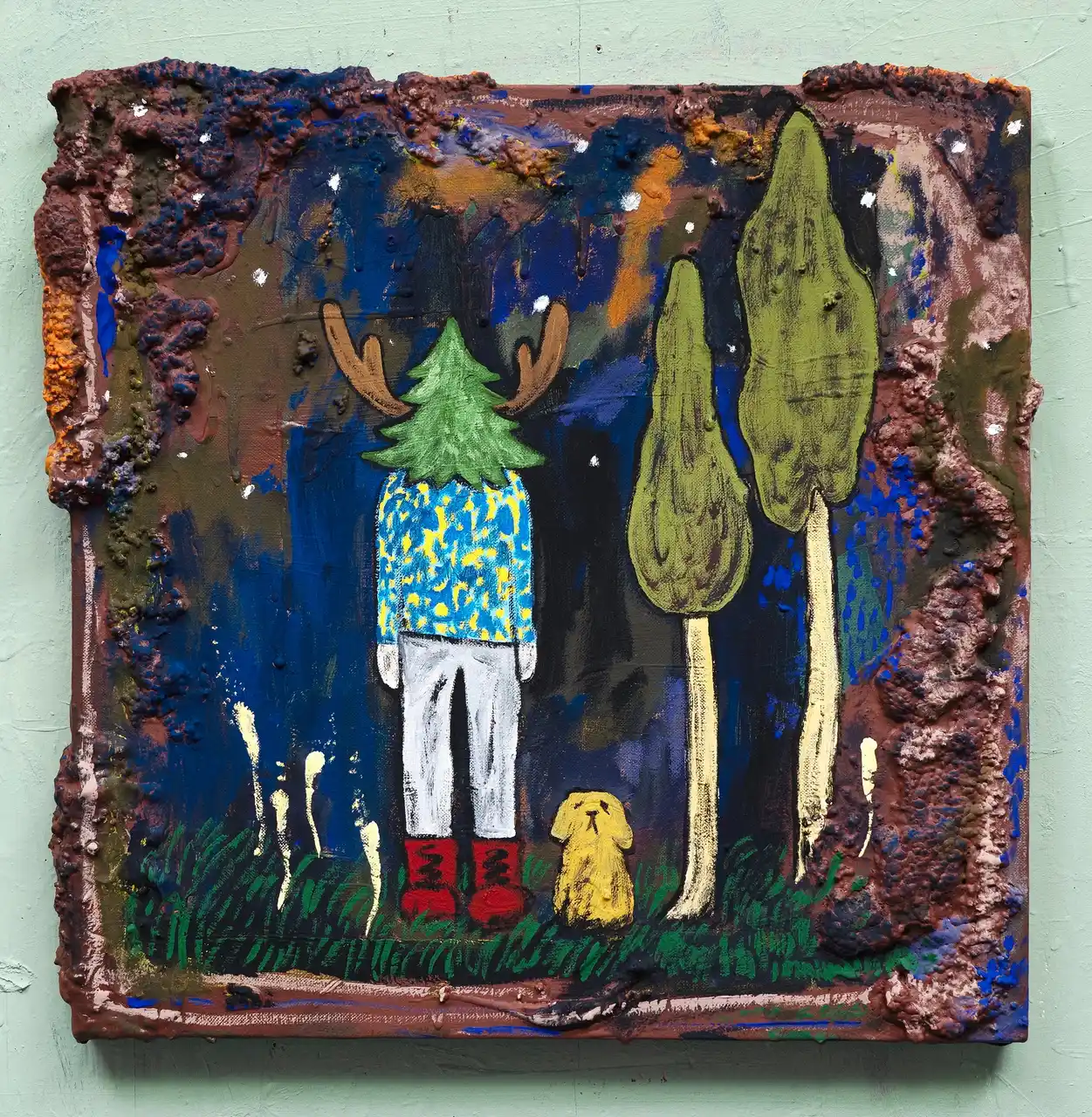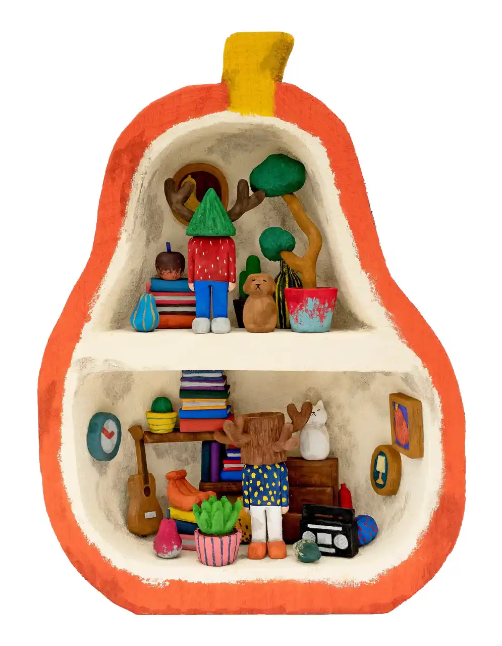 その作品にしばしば現れる、人のような身体に植物の頭部を持つモチーフは、作家が幼少時に岡山の豊かな自然の中で育った経験が原型として存在しています。また、高校卒業後に渡ったロンドンで、街路樹や公園など人の手で整備された植物を「自然」と呼ぶことに抱いた違和感をきっかけに、作品を通じて現代社会における自然と人間の境界線を追求していくこととなります。 |
