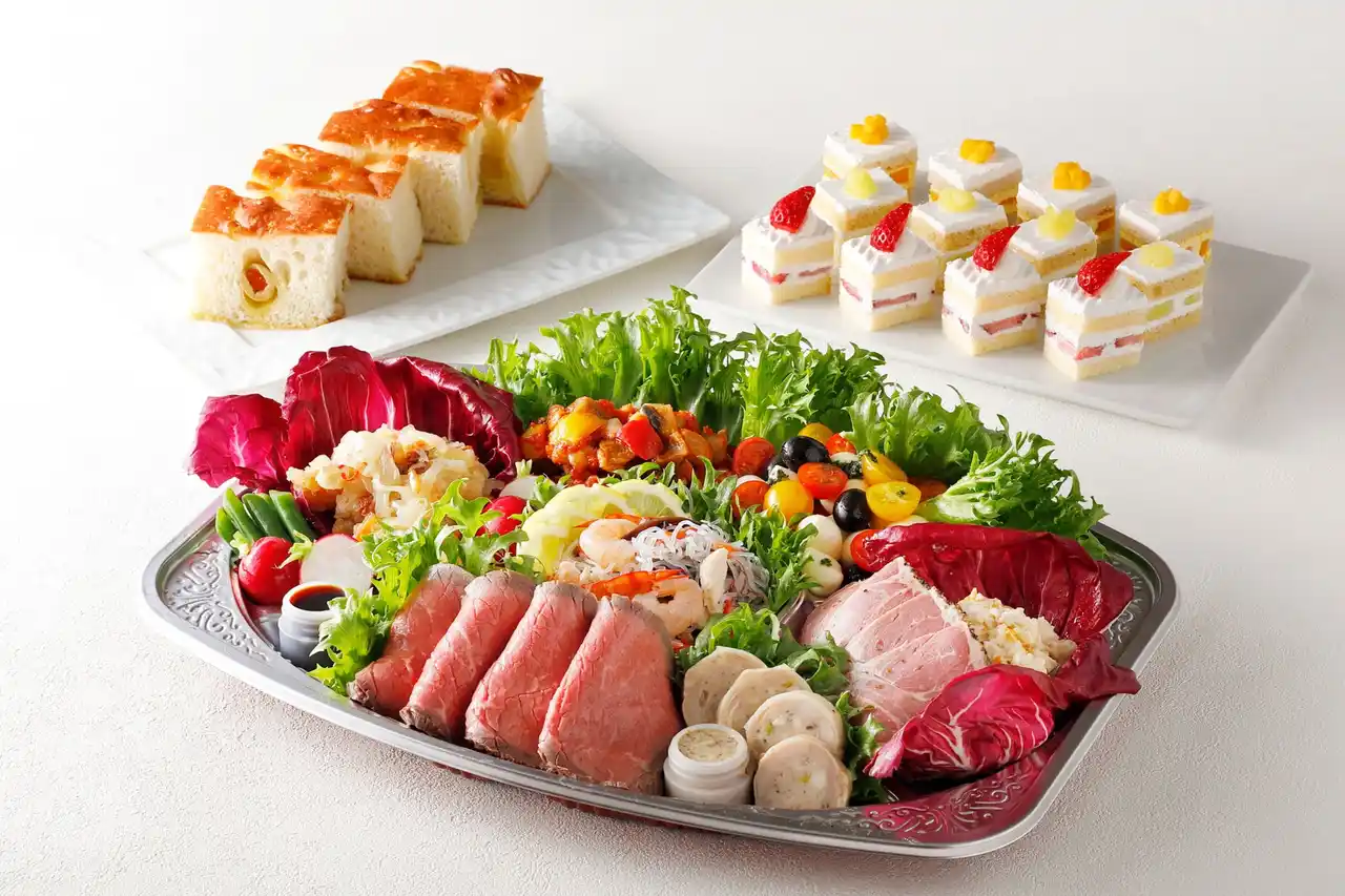 | 花火鑑賞をより一層盛り上げるオードブルには、ビールやワイン、シャンパーニュなどのお酒にぴったりなメニューを豊富に揃えました。旨みあふれる「ローストビーフ 和風ソース」をはじめ、夏にさっぱりといただける「白身魚のエスカベッシュ」や「スモークポテトサラダ」など、彩り豊かな本格ディナーをご堪能いただけます。 さらに食後のデザートには、ホテルニューオータニの代名詞とも言える究極のスイーツ「スーパーメロンショートケーキ」に加え、季節感あふれる「マンゴーショートケーキ」など、3種のショートケーキ盛り合わせをご用意。お食事からデザートまでホテルの贅沢な味わいを丸ごと堪能しながら、夜空を彩る花火と美食の饗宴をお愉しみください。 | |||||||||