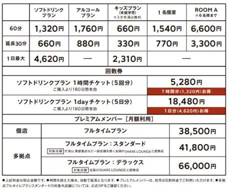 ■SHARE LOUNGE クオーツ心斎橋 料金表 |