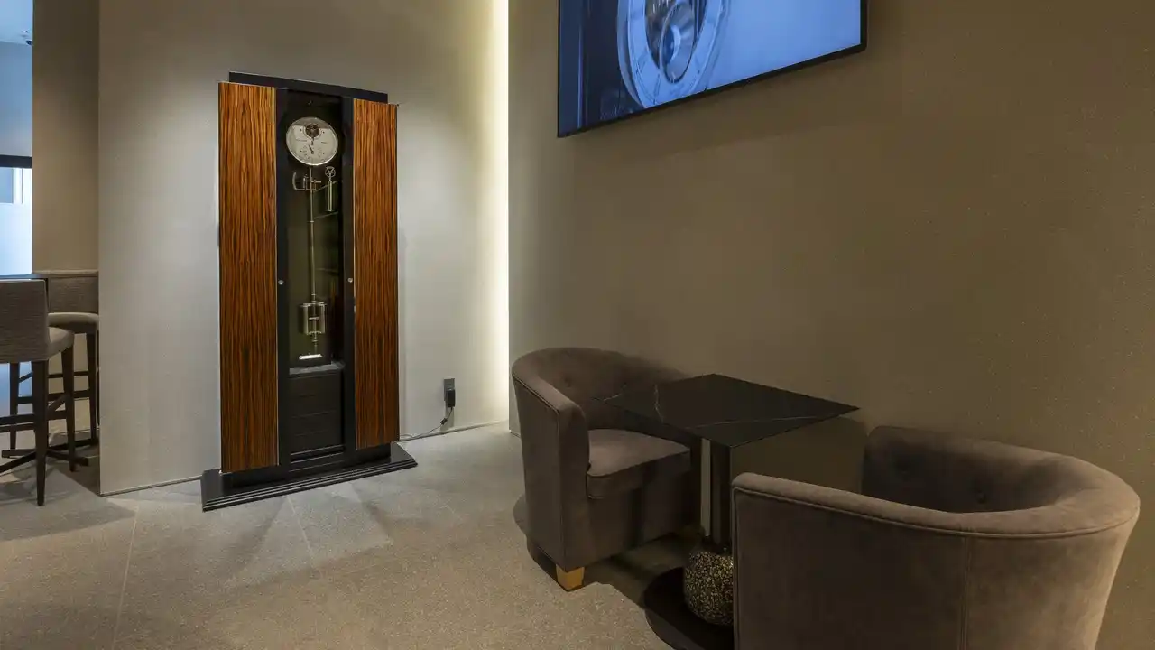 空間デザインにおいても、繊細な時計のパーツを思わせる金属素材を随所に採用しています。時間とともに移ろう陽ざしが金属の表情に反射し、陰影や輝きが刻々と変化することで、空間の中に静かに時間の流れを感じさせます。 |