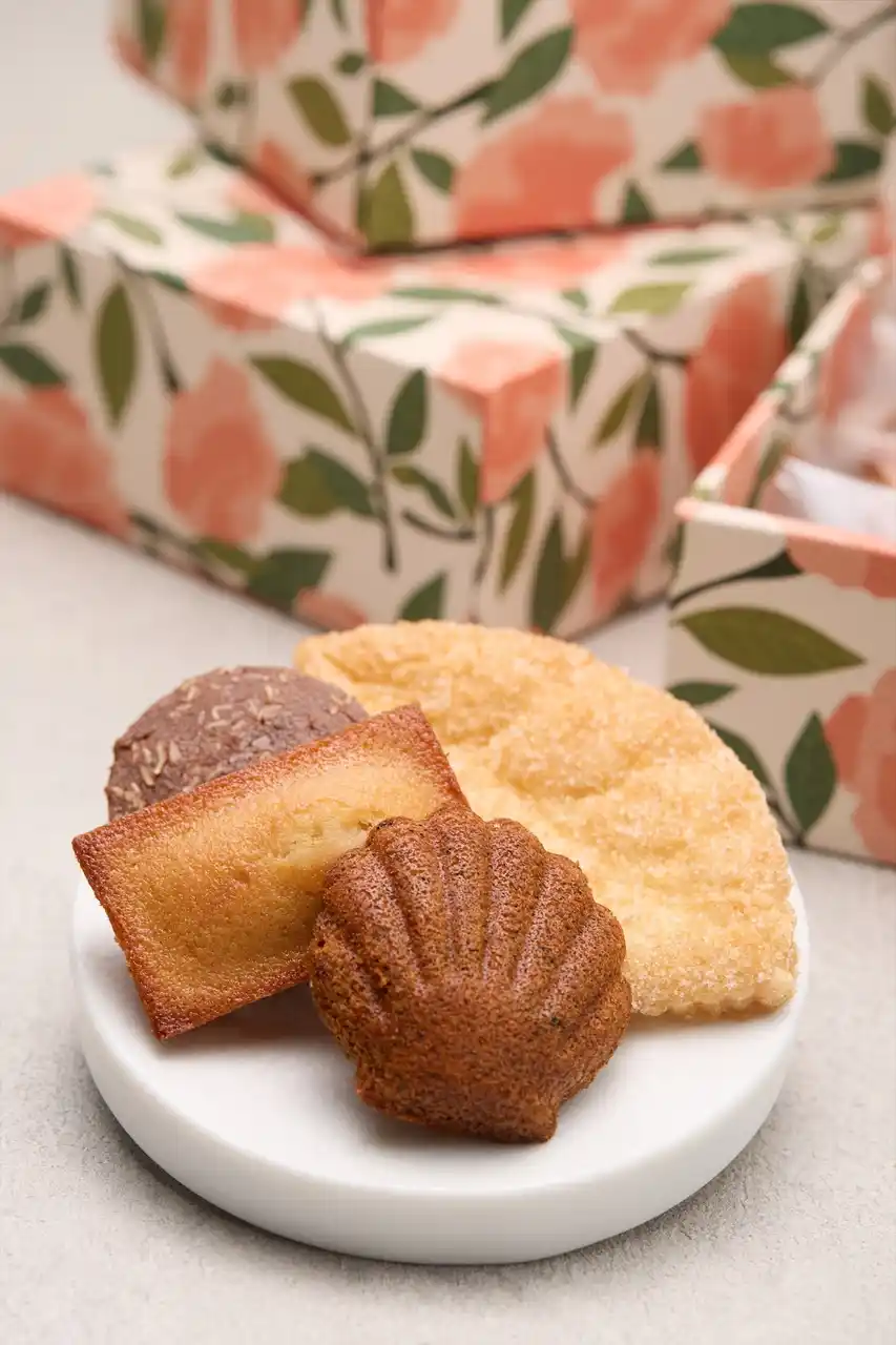 (紅茶のマドレーヌ2個/北海道バターのフィナンシェ2個/アマンドショコラクッキー2枚/リーフパイ1個) |