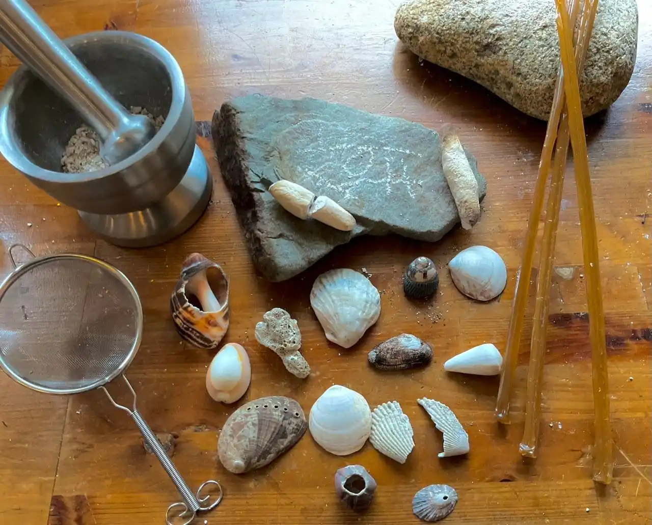 今回は、大月の美しい海岸で採れた本物の「貝殻」や「サンゴ」を使って、自分だけのオリジナルクレヨンを制作します。 |