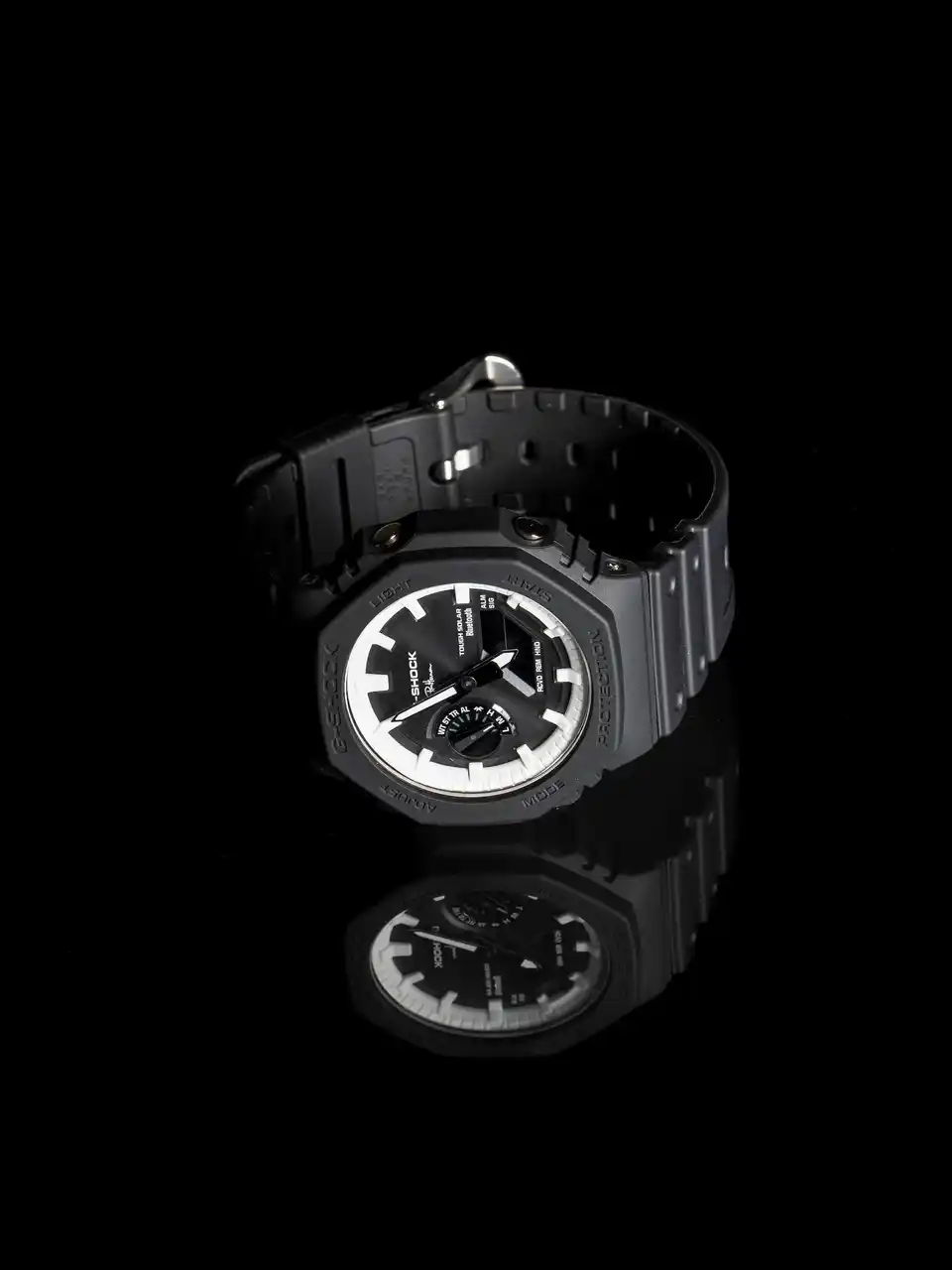 初代G-SHOCKのデザインコンセプトを受け継ぐGA-B2100は、八角形ベゼルのシルエットから“カシオーク”の愛称でも親しまれています。初代のスタイルを踏襲しながら細部にわたってアップデートされ、スマートフォンリンクおよびタフソーラーを搭載。高機能化に伴い、薄型モジュールを開発し、従来モデルのサイズバランスを維持しています。 ベゼルはワントーンで仕上げ、無駄な装飾を排除しています。 文字盤はすべての表記をホワイトに統一し、インデックスおよび外周部のカラーリングも白で揃えることで、高い視認性とミニマルな印象を両立しました。フェイスとバックケースにはRon Hermanの刻印が入る特別仕様です。 さらに、液晶には反転液晶を採用し、全体のトーンを引き締めるとともに、モダンな表情を演出。針の仕様や細部のパーツ構成にも調整を加え、統一感のある仕上がりへと導いています。 |