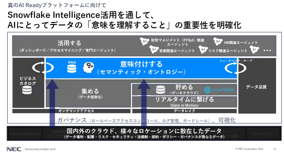 構造化データだけでなく、社内に約30PB存在する文書や音声などの「非構造化データ」を活用するため、同社はSnowflake Intelligenceを導入。これをNEC(NGS)の技術でさらに拡張し、以下の3点で強化を図っています。 |