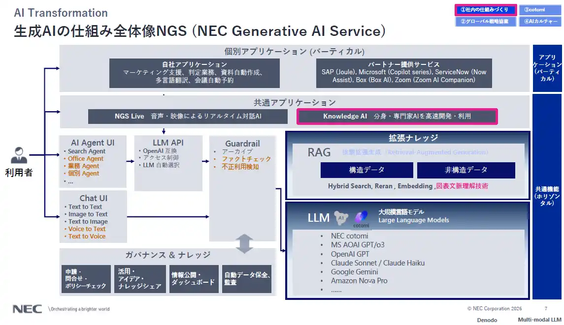 NECではAI活用を支える取り組みとして、最新LLMをセキュアに利用できる「NEC Generative AI Service(NGS)」を整備し、RAGの仕組みを通じて社内データを活用できる環境を構築。国内約8万人の従業員が利用可能な基盤として展開しています。さらに、個人の分身や専門知識を持つAIを容易に作成できる基盤「Knowledge
