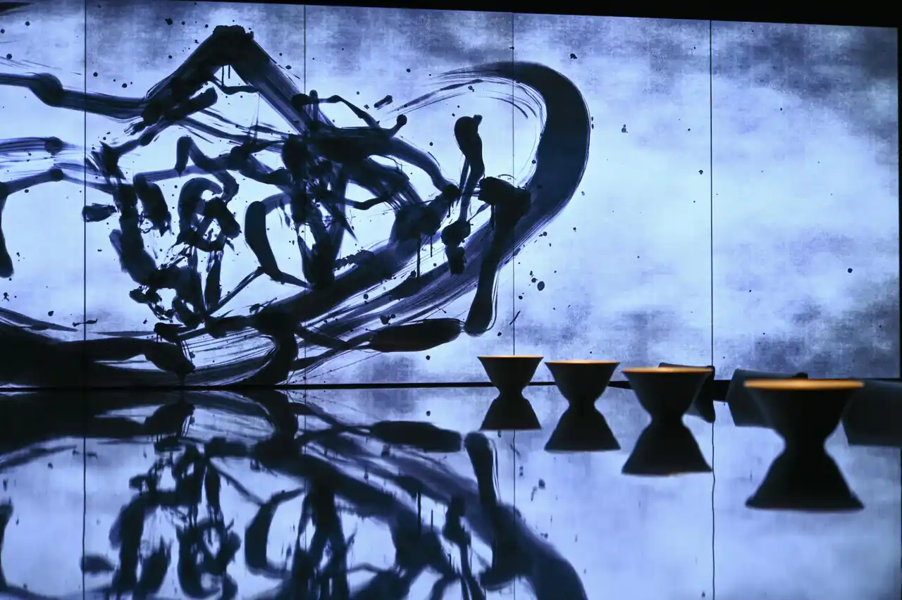 Vegan Ramen UZUの理念「地球に優しい食」チームラボの哲学「自然と人、人と人のつながり」をテーマにしたアート空間が食と融合する。墨書が壁と黒いテーブルに左右反転するデジタルアートは自然と食の調和、森羅万象に通ずる。同じ食卓で食事をすることも、人類の共存共栄のようでもある。 |