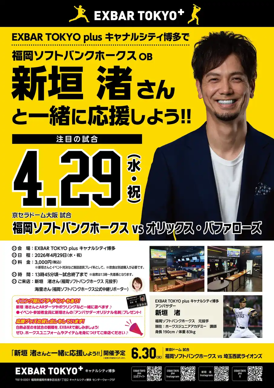 株式会社タイトー(本社:東京都新宿区、以下タイトー)が運営する福岡県福岡市のキャナルシティ所在のクラフトビール&ゲームバー「EXBAR TOKYO plus 博多」では、2026年4月29日(水・祝)にイベント「福岡ソフトバンクホークスOB新垣渚さんと一緒に応援しよう!」を開催いたします。 当店アンバサダーを務める新垣渚さんと福岡ソフトバンクホークス公式中継リポーター海里さんが来店の上、お2人のトークや店内のダーツやボウリングを一緒に楽しめるなど、直接交流型のイベントです。 |